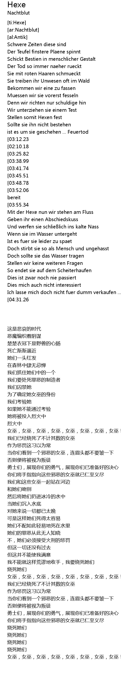 | [02:13.51][03:38.99] | zahllose Hexen wir haben schon verbrannt |