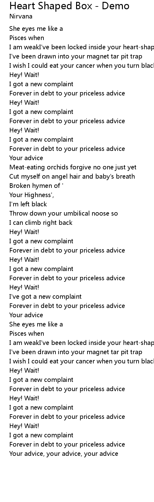 | I am weakI' ve been locked inside your heartshaped box for weeks | |
