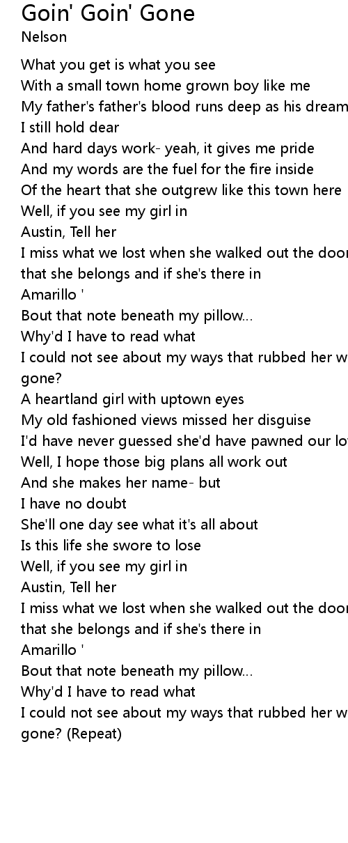 | I could not see about my ways that rubbed her wrong when she was goin', goin', gone? Repeat |