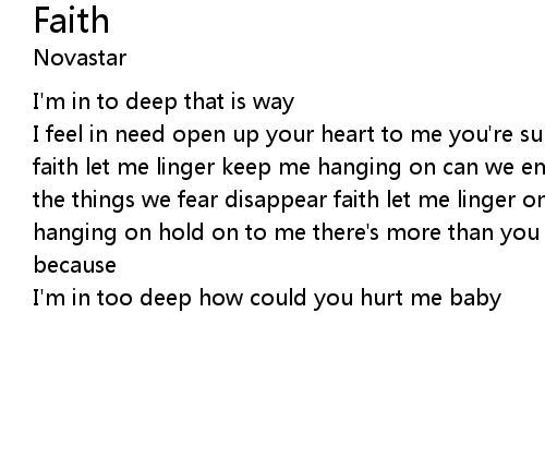 | I feel in need open up your heart to me you're surreal faith let me linger on faith let me linger keep me hanging on can we embrace the love we face if we let the things we fear disappear faith let me linger on faith let me linger keep me hanging on hold on to me there's more than you ever saw hold on to me yeah because | |