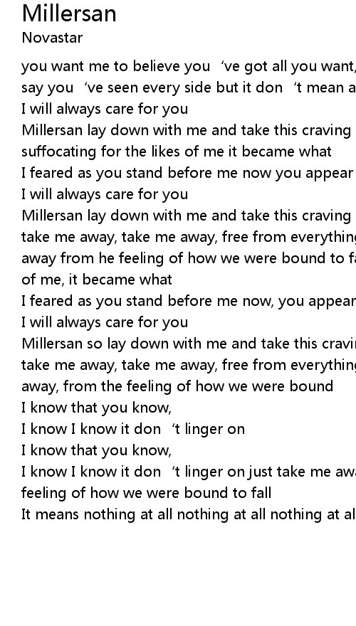 | Millersan lay down with me and take this craving hand or get up while you can take me away, take me away, free from everything you say take me away, take me away from he feeling of how we were bound to fall to suffocating for the likes of me, it became what | |
