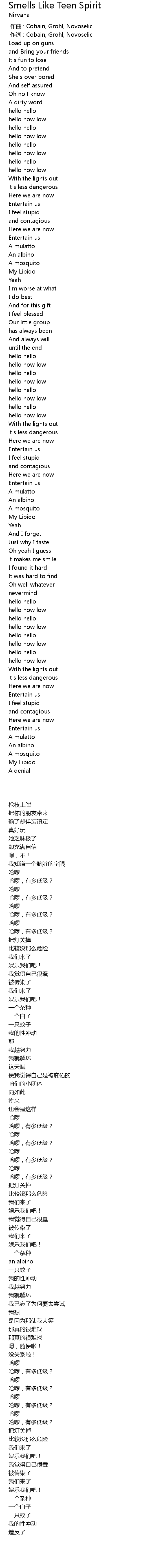 | [00:01.00] | 作词 : Cobain, Grohl, Novoselic |