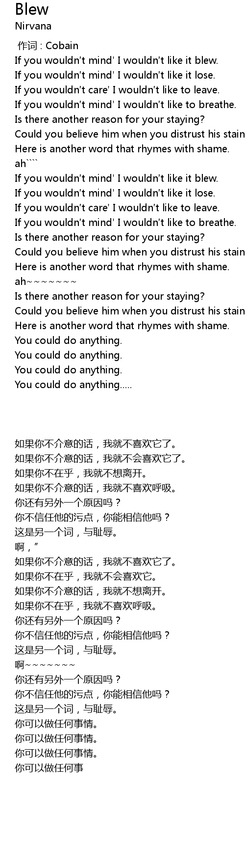 | [00:59.15] | If you wouldn t mind' I wouldn t like it blew. |