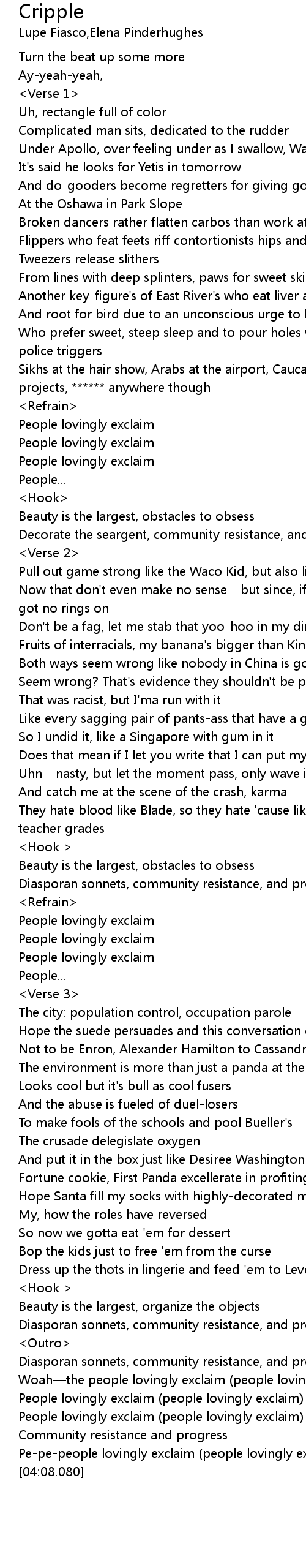 | [01:27.740] | Fruits of interracials, my banana's bigger than King Kong |