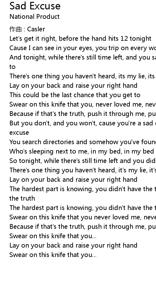 | But you don' t, and you won' t, cause you' re a sad excuse, yeah you' re a sad excuse | |