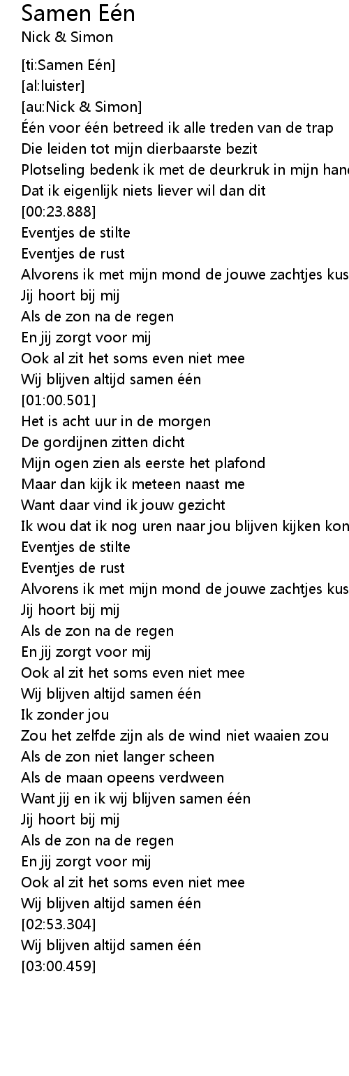 | [02:25.629] | Want jij en ik wij blijven samen éé n |