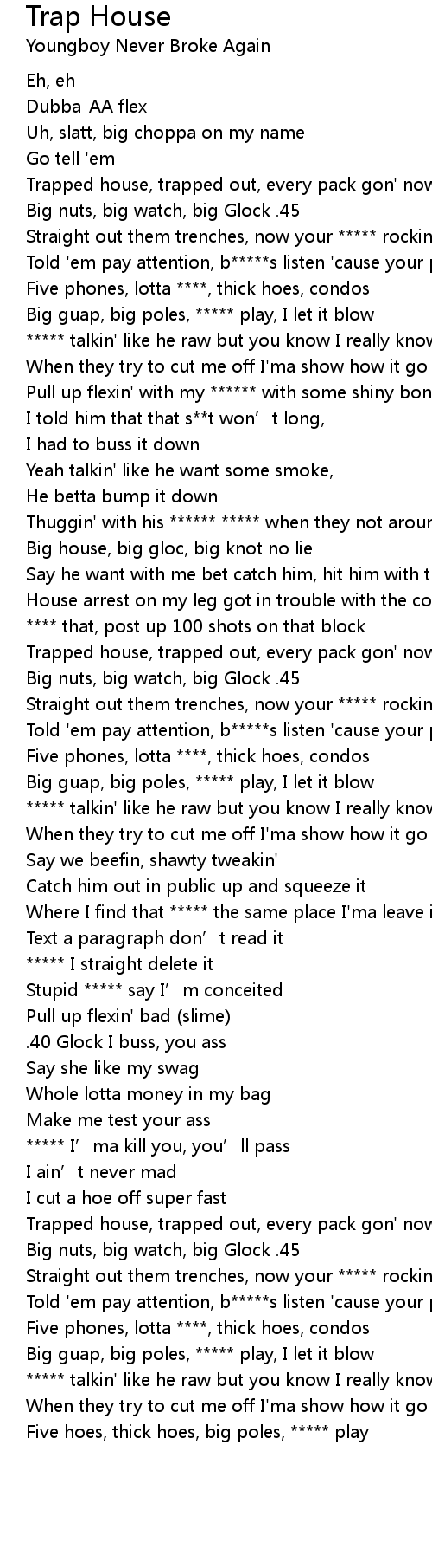 | [00:11.70] | Trapped house, trapped out, every pack gon' now |
