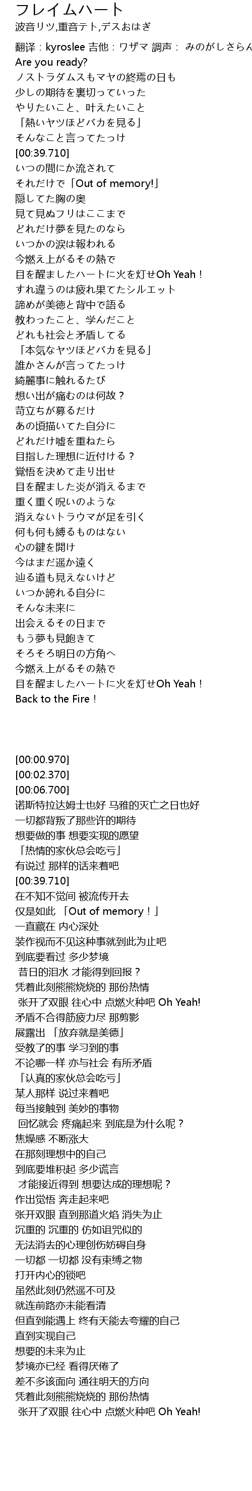 | [02:04.250] | 目を醒ました炎が消えるまで |