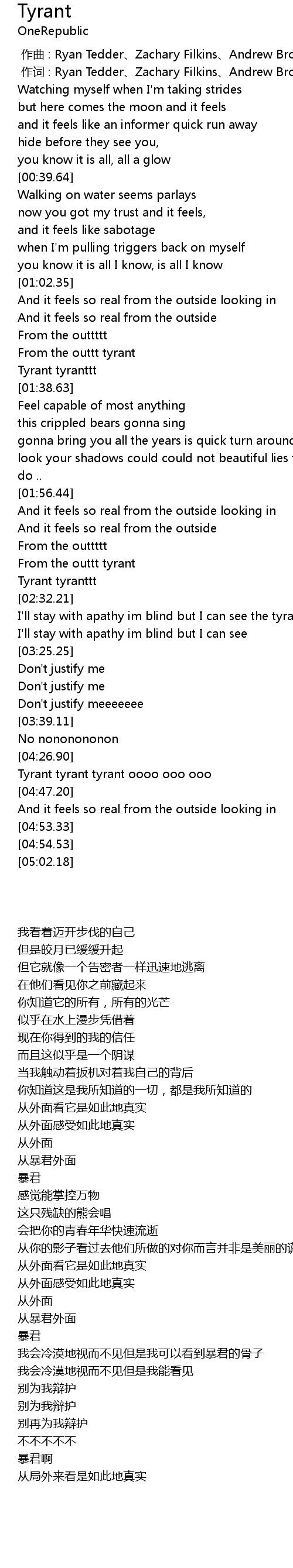 | [00:01.00] | 作词 : Ryan Tedder、Zachary Filkins、Andrew Brown |