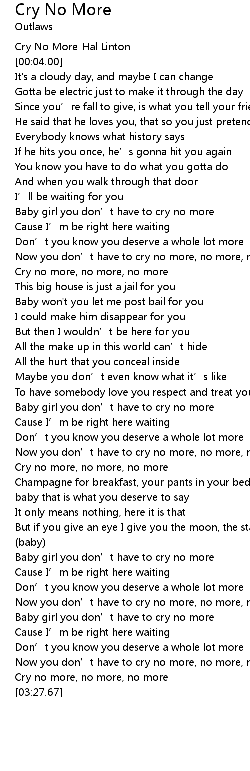 | [00:47.07] | Baby girl you don' t have to cry no more |