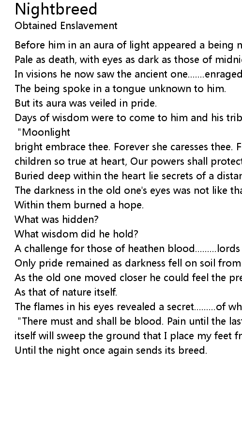 The flames in his eyes revealed a secret.........of what was to be. [Voice of the old one:] "There must and shall be blood. Pain until the last drop. As night itself will sweep the ground that I place my feet free of purity ever after. Until the night once again sends its breed. |
