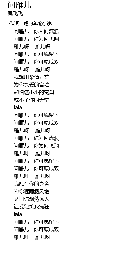 | [00:19.64] | wèn yàn ér nǐ wèi hé fēi xiáng |