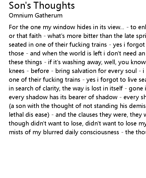 For the one my window hides in its view... - to enlighten me if my love's real, or that faith - what's more bitter than the late spring - i forgot to live, seated in one of their fucking trains - yes i forgot to live seated in one of those - and when the world is left i don't need an inscription to remind for these things - if it's washing away, well, you know what - praying on one's knees - before - bring salvation for every soul - i forgot to live, seated in one of their fucking trains - yes i forgot to live seated in one of those - when in search of clarity, the way is lost in itself - gone into its own walker - and every shadow has its bearer of shadow - every shadow has its bearer of shadow - (a son with the thought of not standing his demise - still afraid of getting a lethal dis ease) - and the clauses they were, they were all without reins - though didn't want to lose, didn't want to lose my heart - somewhere in the mists of my blurred daily consciousness - the thought of not standing a dis ease |