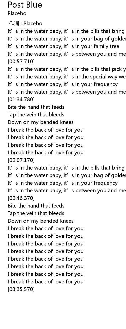 | [02:26.150] | It' s in the water baby, it' s in the pills that bring you down |