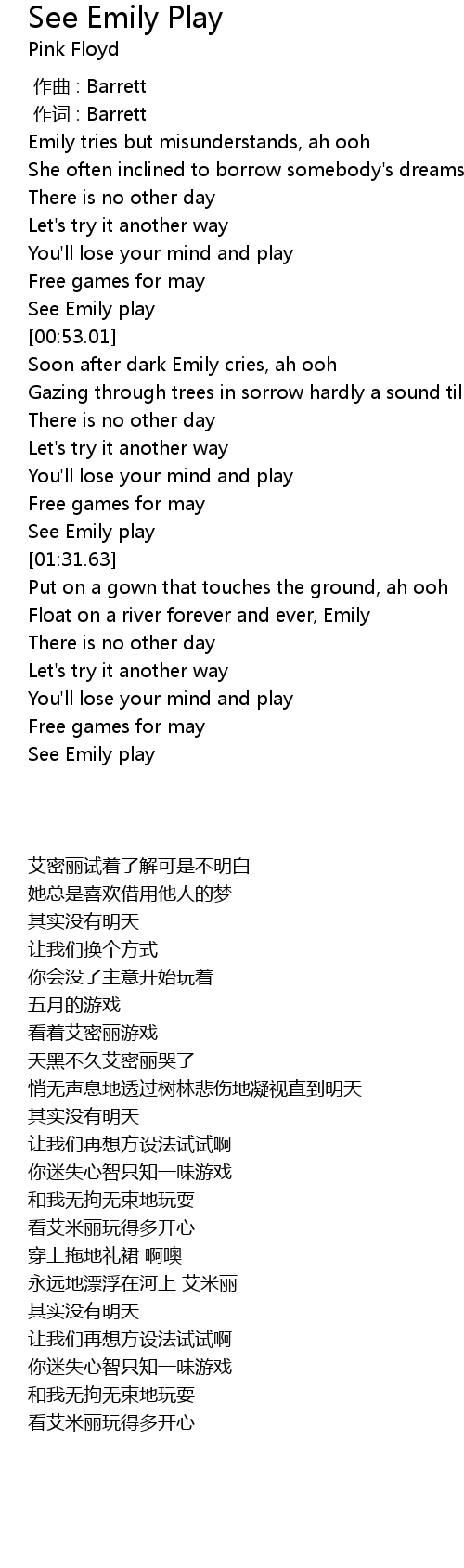 | [00:56.20] | Soon after dark Emily cries, ah ooh |