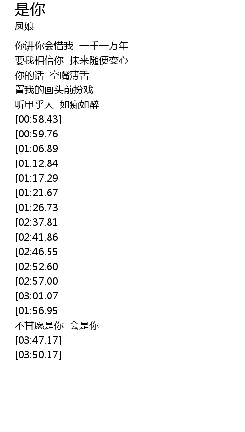 | [03:30.82][03:01.07][01:51.17] | 不甘愿是你乎我来伤心 |