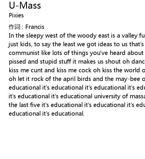 | In the sleepy west of the woody east is a valley full, full o' pioneer we' re not just kids, to say the least we got ideas to us that' s dear like capitalist, like communist like lots of things you' ve heard about and redneckers they get us pissed and stupid stuff it makes us shout oh dance with me oh don' t be shy oh kiss me cunt and kiss me cock oh kiss the world oh kiss the sky oh kiss my ass oh let it rock of the april birds and the maybee oh baby it' s educational it' s educational it' s educational it' s educational it' s educational it' s educational it' s educational it' s educational university of massachusetts, please and here' s the last five it' s educational it' s educational it' s educational it' s educational it' s educational. |