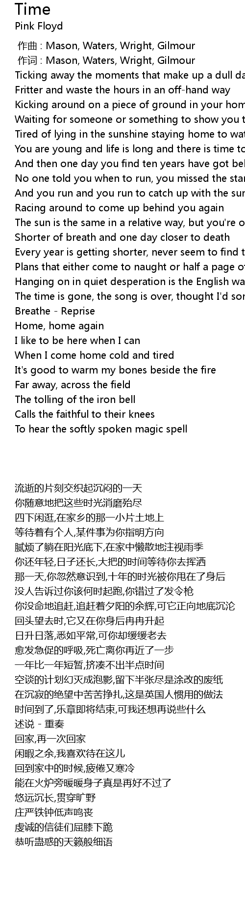 | [00:01.00] | 作词 : Mason, Waters, Wright, Gilmour |