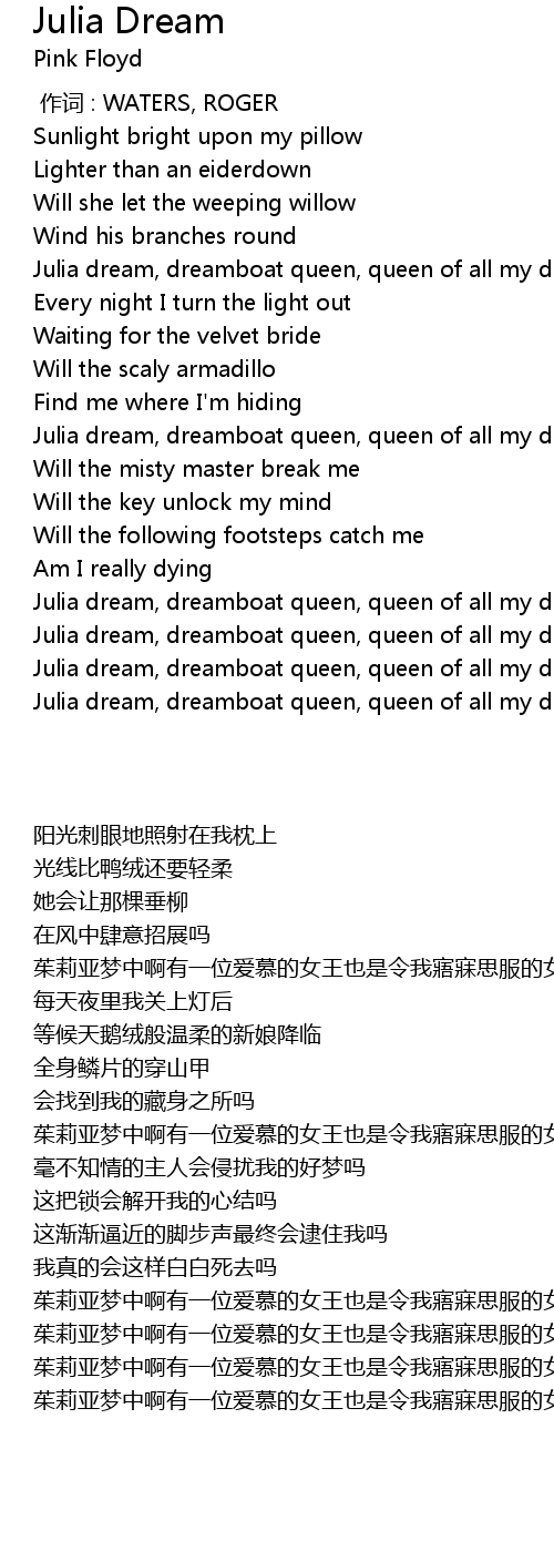 | [01:43.480] | Julia dream, dreamboat queen, queen of all my dreams |