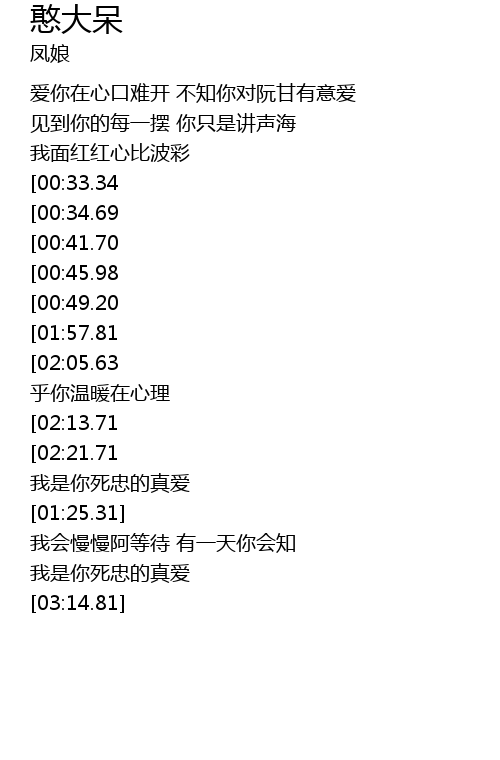 | [02:45.74][02:13.71][01:07.68] | 你是一勒憨大呆 我尬意你彼呢阿实在 |