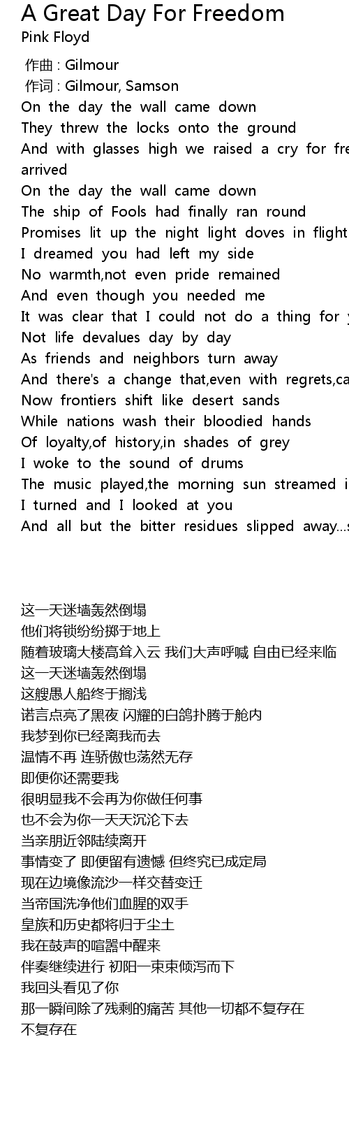 | [00:10.64] | And with glasses high we raised a cry for freedom had arrived |