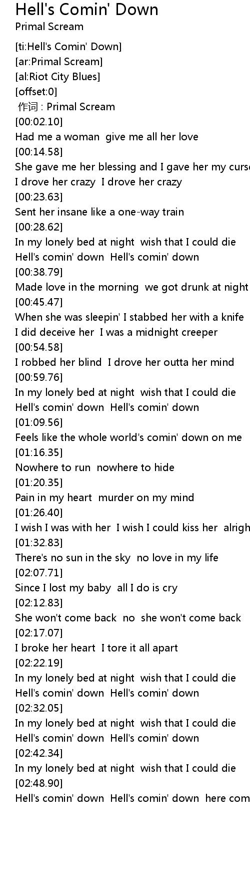 | [02:49.77] | Hell's comin' down Hell's comin' down here comes Hell |