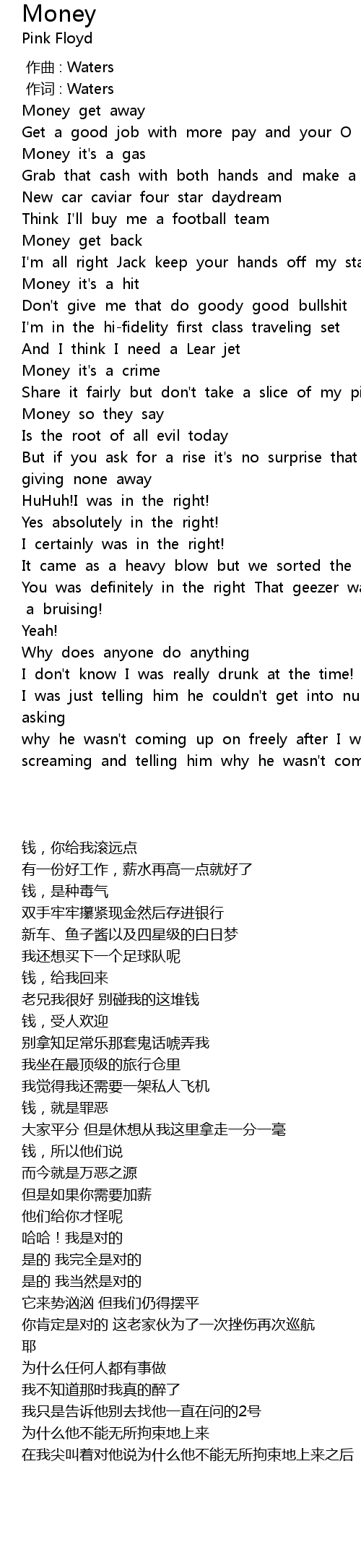 | [00:01.00] | 作词 : Waters |