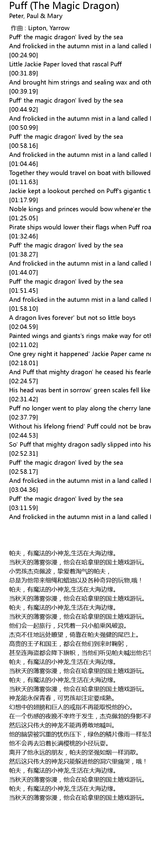 | [01:33.03] | Puff' the magic dragon' lived by the sea |