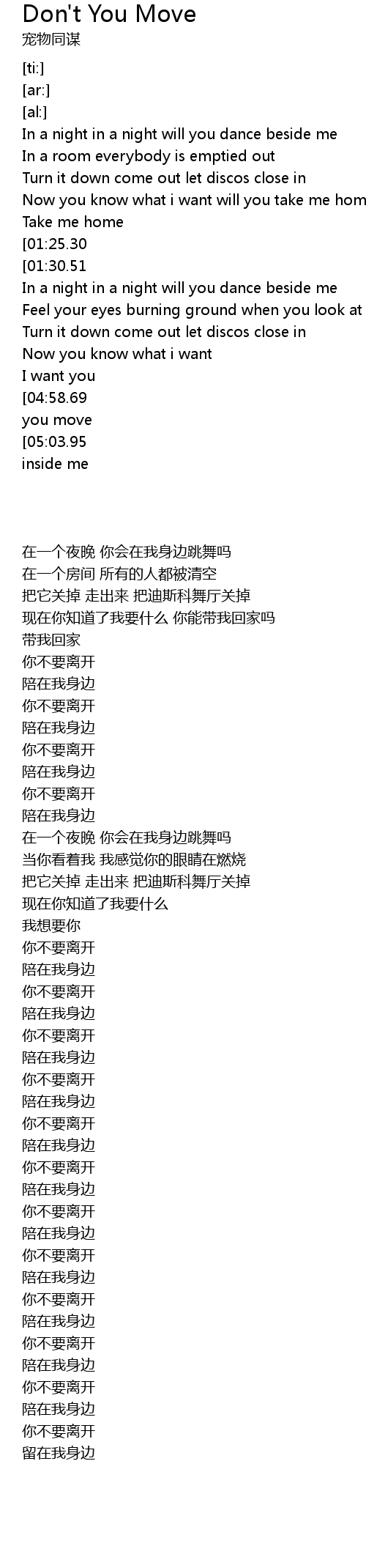 | [05:05.68][04:58.69][04:50.88][04:43.77][04:08.36][04:01.56][03:54.47][03:47.63][02:43.50][02:36.41][02:29.26][02:22.03] | Don' t you move |