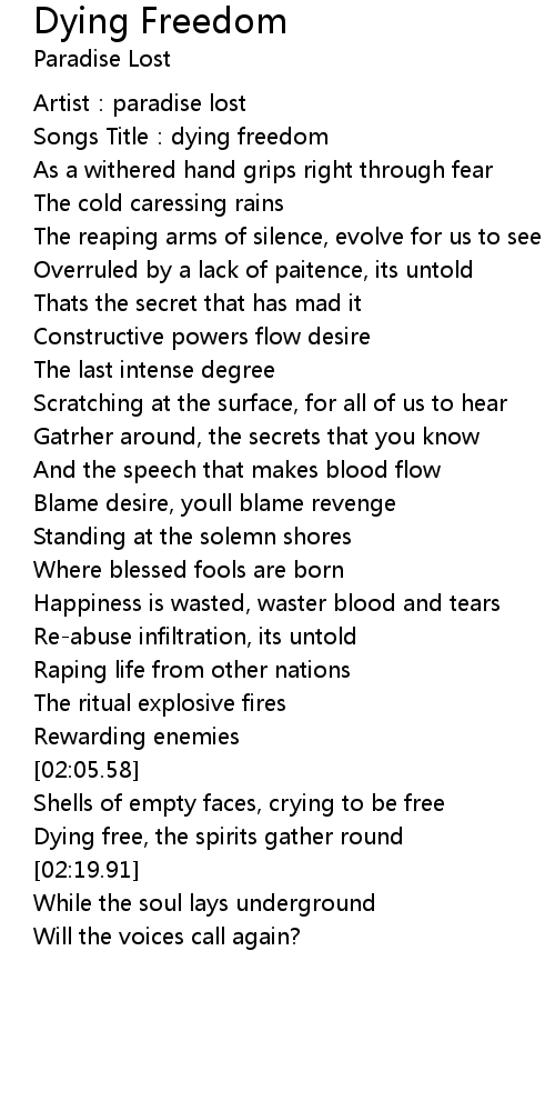 | [02:10.84] | Shells of empty faces, crying to be free |
