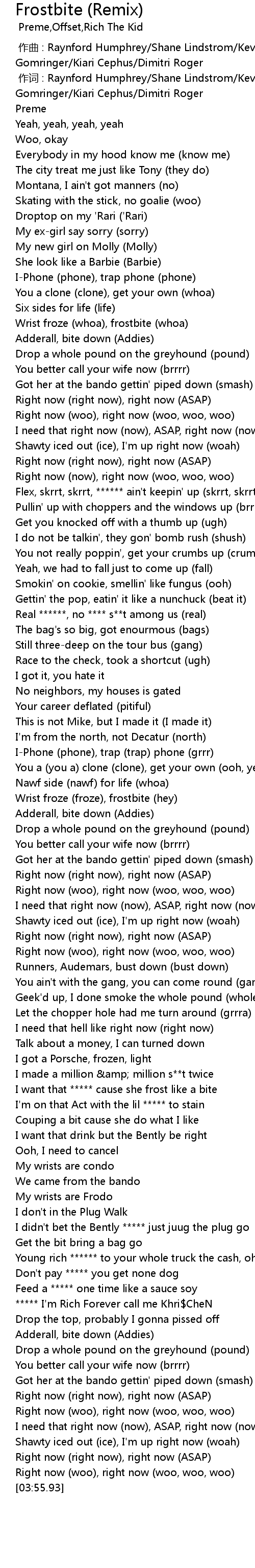 | [00:43.16] | Wrist froze whoa, frostbite whoa |