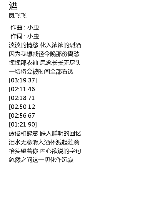 | [03:03.16][02:50.12][02:24.06][01:05.84] | 纵有千种离愁 还是需要一杯酒 |