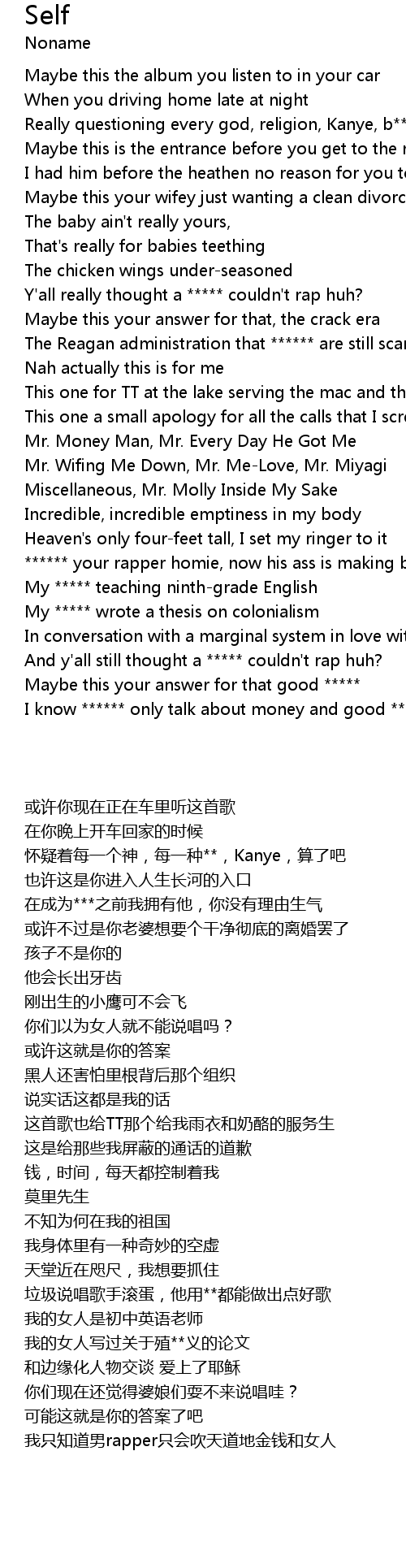 | [00:25.31] | Really questioning every god, religion, Kanye, b*****s |