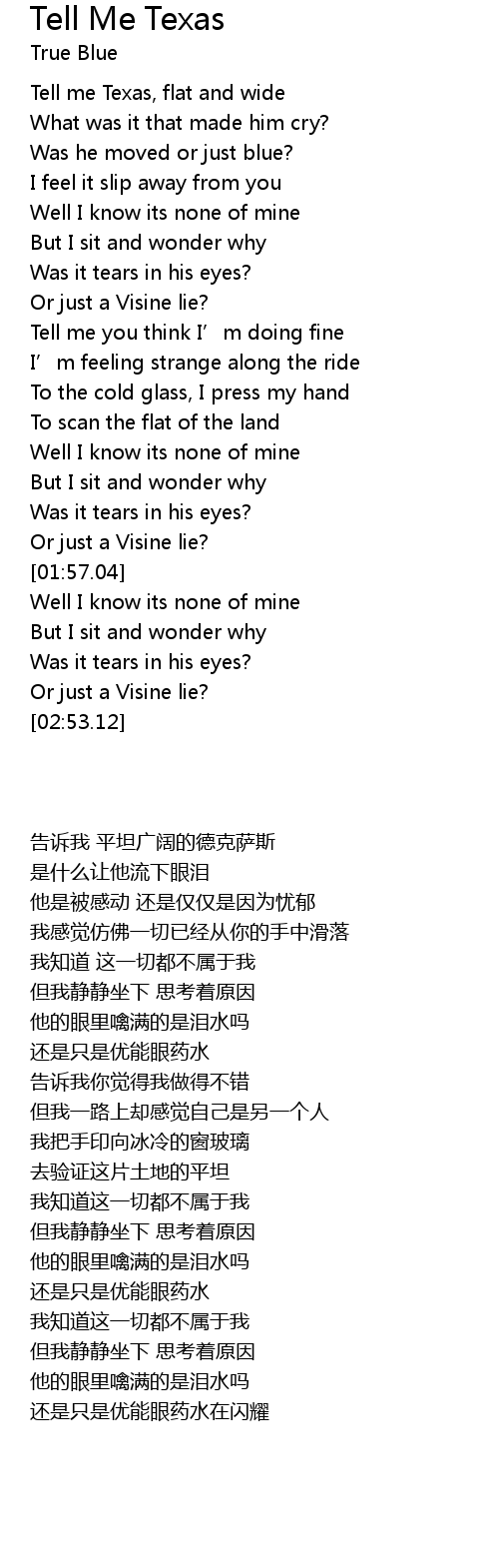 | [00:00.94] | Tell me Texas, flat and wide |