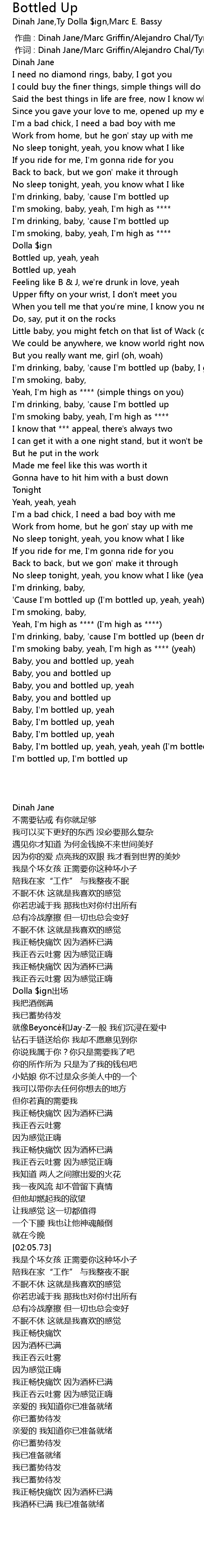 | [02:36.47] | I'm drinking, baby, 'cause I'm bottled up (been drinking, oh) |