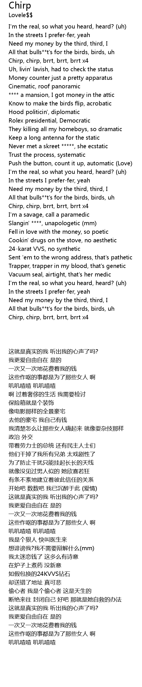 | [01:21.87] | Chirp, chirp, brrt, brrt, brrt x4 |