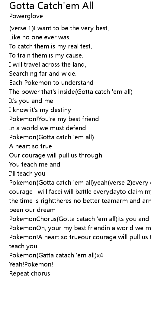 Pokemon(Gotta catch 'em all)yeah(verse 2)every challenge along the waywith courage i will facei will battle everydayto claim my rightful placecome with me the time is righttheres no better teamarm and arm well win the fightits always been our dream |