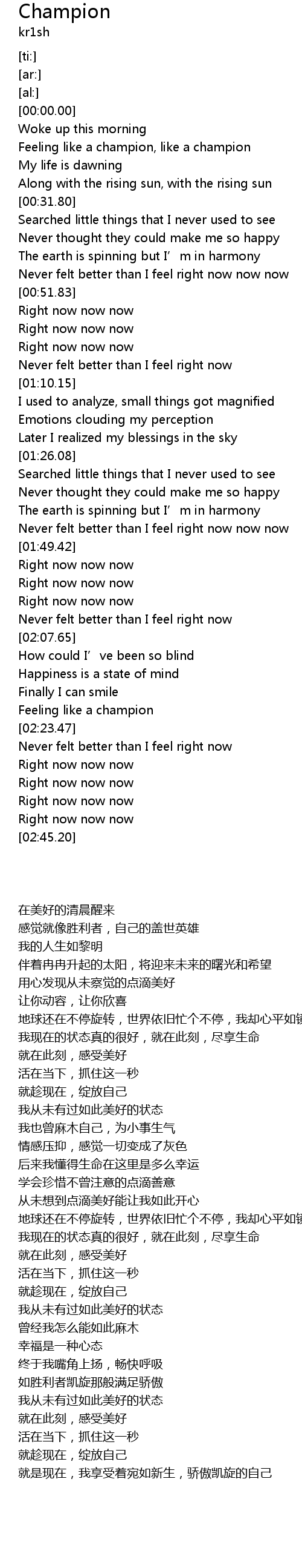 | [00:17.81] | Feeling like a champion, like a champion |