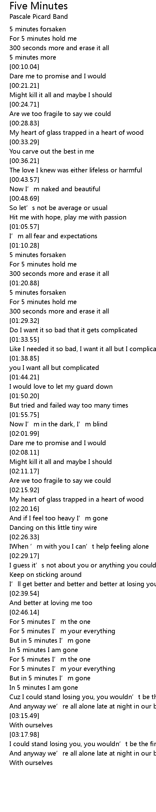 | [01:23.81] | For 5 minutes hold me |