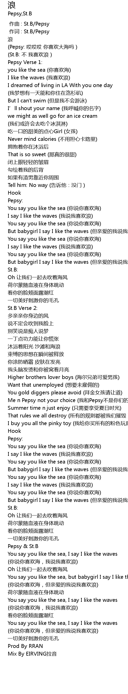 | [02:09.293] | You say you like the sea, but babygirl I say I like the waves ni shuo ni xi huan hai, dan qin ai de wo shuo wo xi huan lang |