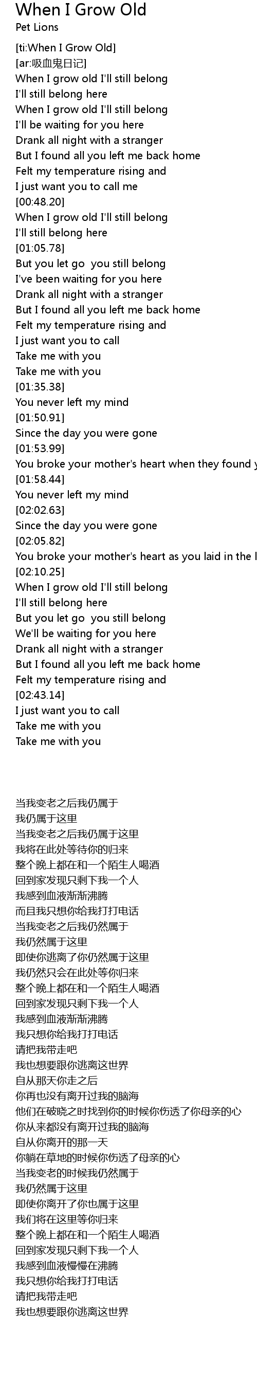 | [02:23.34] | When I grow old I' ll still belong |