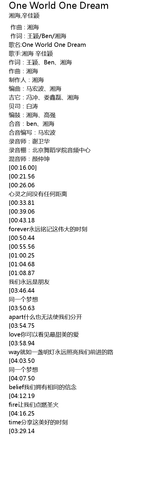 | [04:20.81][03:46.44][02:51.80][01:17.50] | One world one dream同一个世界 同一个梦想 |