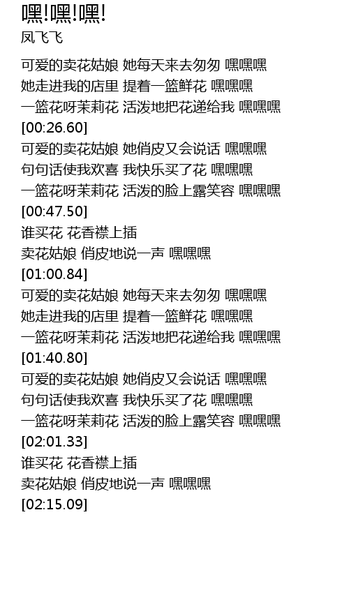 | [02:08.68] | 卖花姑娘 俏皮地说一声 嘿嘿嘿 |