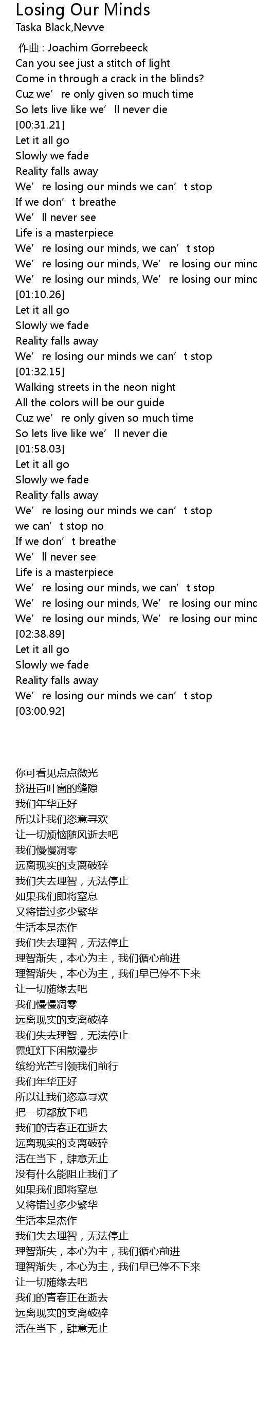 | [00:57.40] | We' re losing our minds, We' re losing our minds we can' t stop |