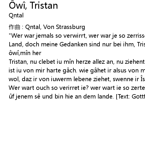| "Wer war jemals so verwirrt, wer war je so zerrissen wie ich? Ich stehe hier an Land, doch meine Gedanken sind nur bei ihm, Tristan, dort auf dem Meer." Ôwî ôwî,mîn her | |