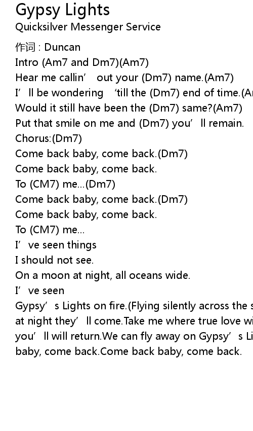 | Gypsy’s Lights on fire.(Flying silently across the sky.ChorusLeadOn some moon at night they’ll come.Take me where true love will never die.Maybe then you’ll will return.We can fly away on Gypsy’s Lights.ChorusOuttro:Come back baby, come back.Come back baby, come back. |