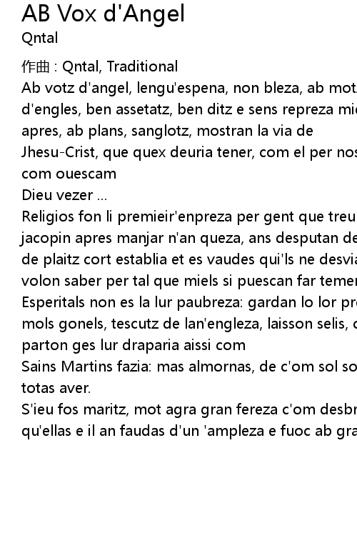 | Ab votz d' angel, lengu' espena, non bleza, ab motz sotils, plans plus c' obra d' engles, ben assetatz, ben ditz e sens repreza miels escoutatz, ses tossir, que apres, ab plans, sanglotz, mostran la via de | |