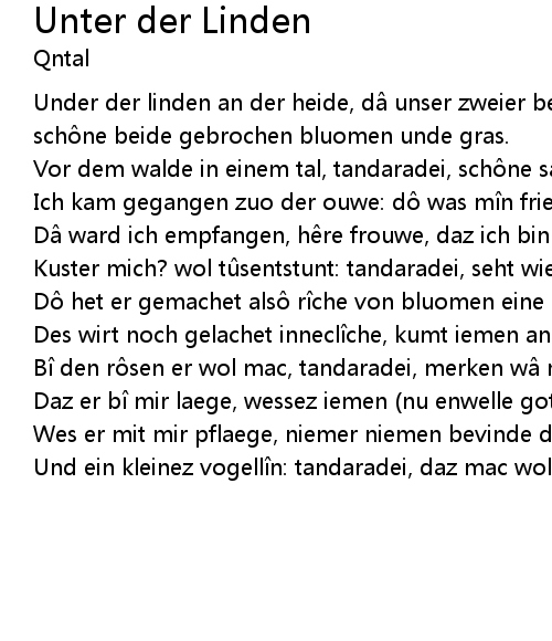 | Under der linden an der heide, d unser zweier bette was, d muget ir vinden sch ne beide gebrochen bluomen unde gras. | |