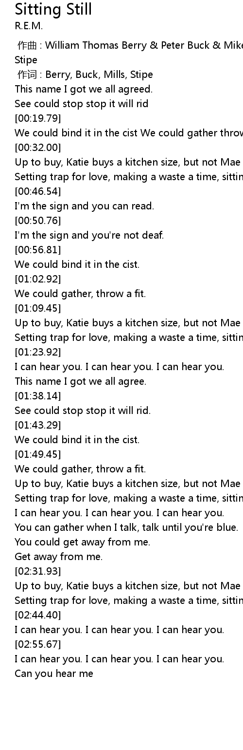 | [00:00.00] | zuò qǔ : William Thomas Berry Peter Buck Mike Mills Michael Stipe |