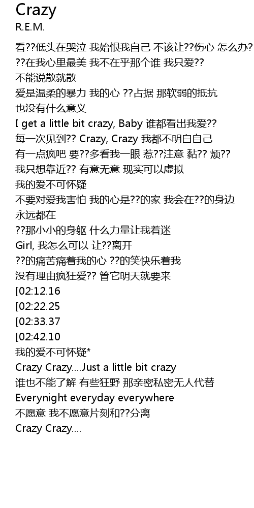 | [02:57.59] | Crazy Crazy.... Just a little bit crazy |